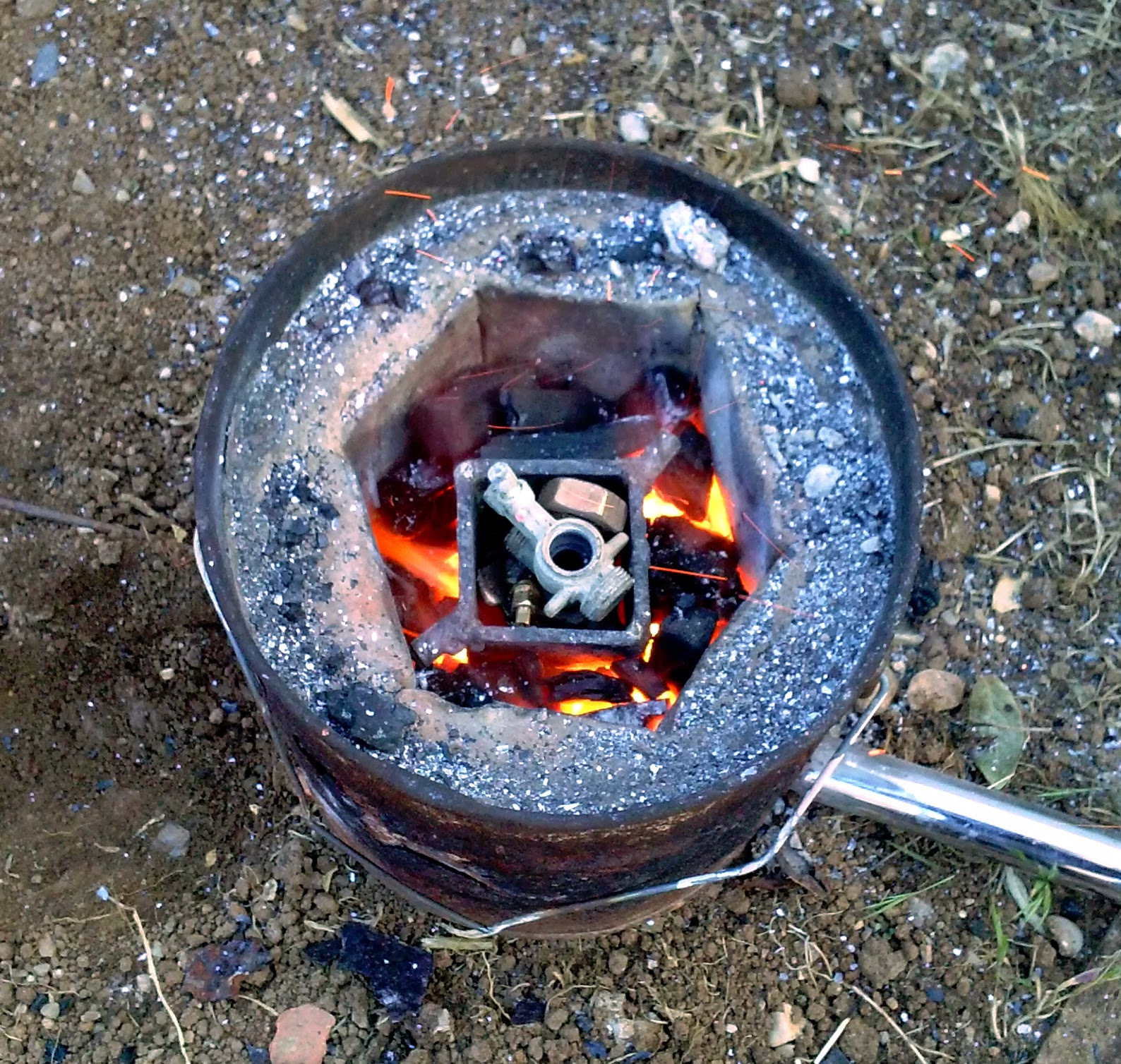 El tercer punto es el material a fundir en sí, principalmente utilizo aluminio, un metal relativamente resistente y bastante ligero, su temperatura de fusión es baja, en torno a 620ºC ~ 650ºC y es un metal que se puede conseguir una gran cantidad de manera fácil, Otro metal interesante para fundir es el latón, aunque su temperatura de fusión esta entre 850ºC y 1000ºC es más denso y resistente que el aluminio. Por último también he fundido cobre, este metal es el más difícil de fundir, ya que su temperatura de fusión es de 1050ºC y requiere mantener la fragua al máximo durante bastante tiempo, aunque a este metal no le he encontrado ninguna ventaja llamativa.